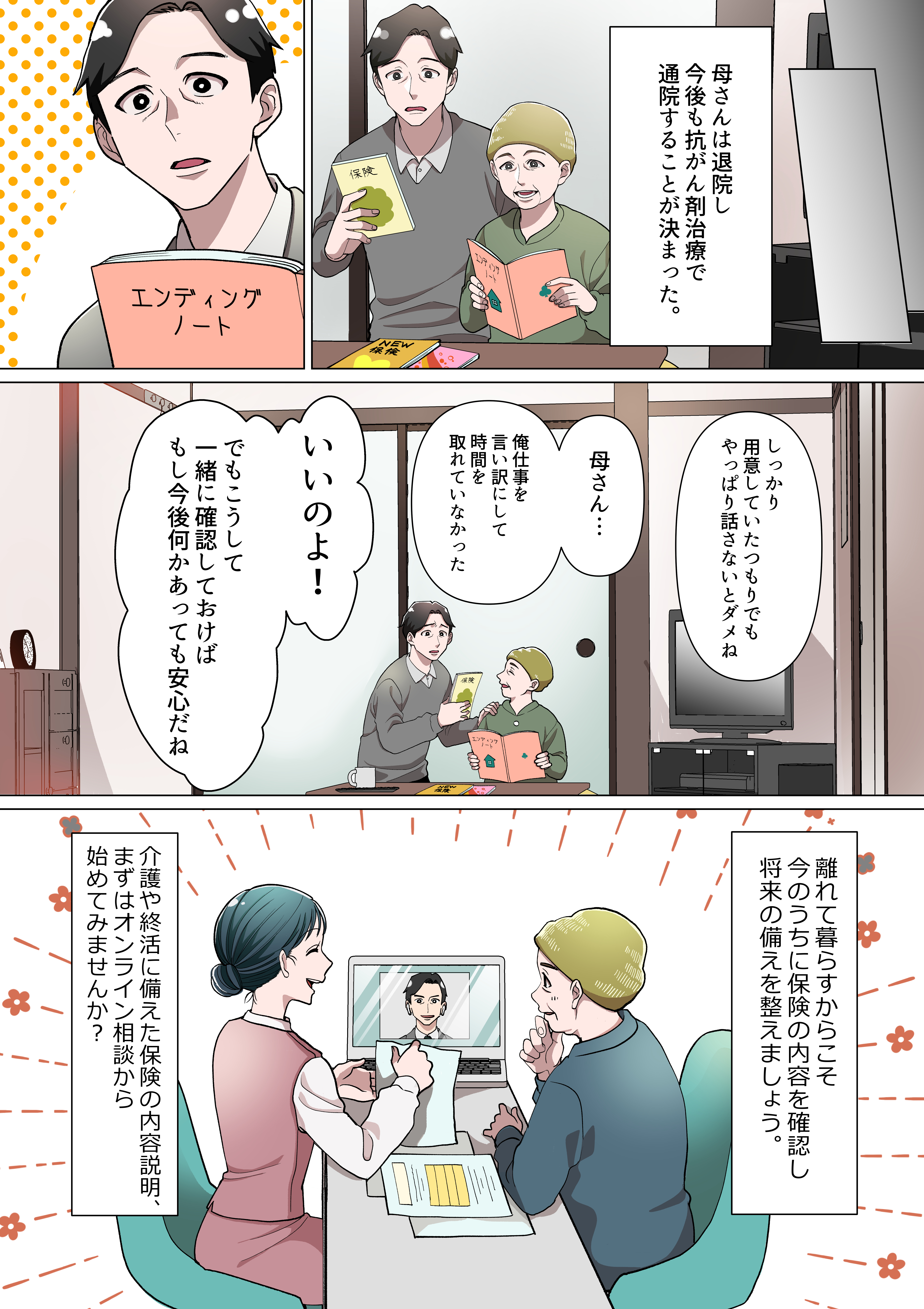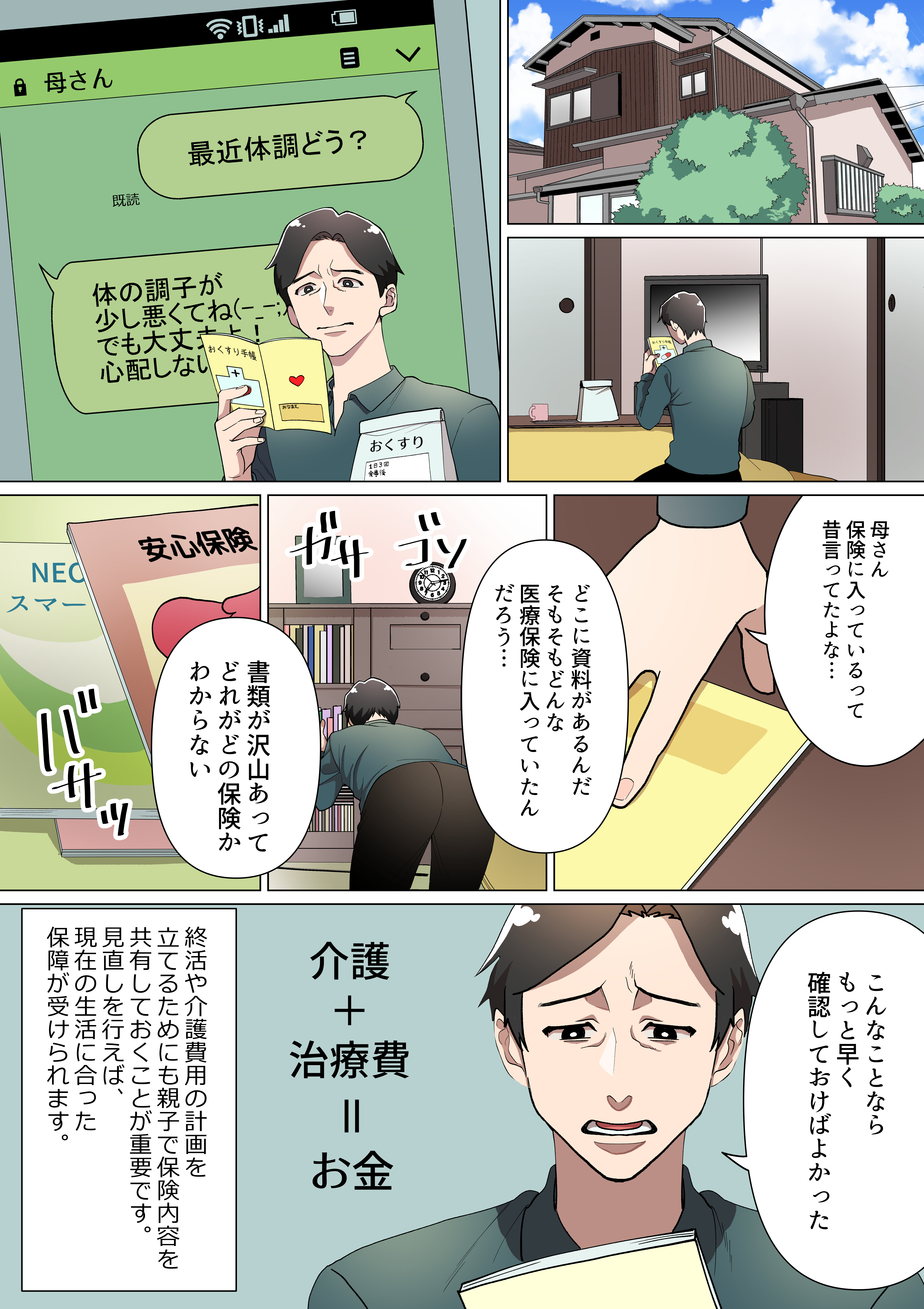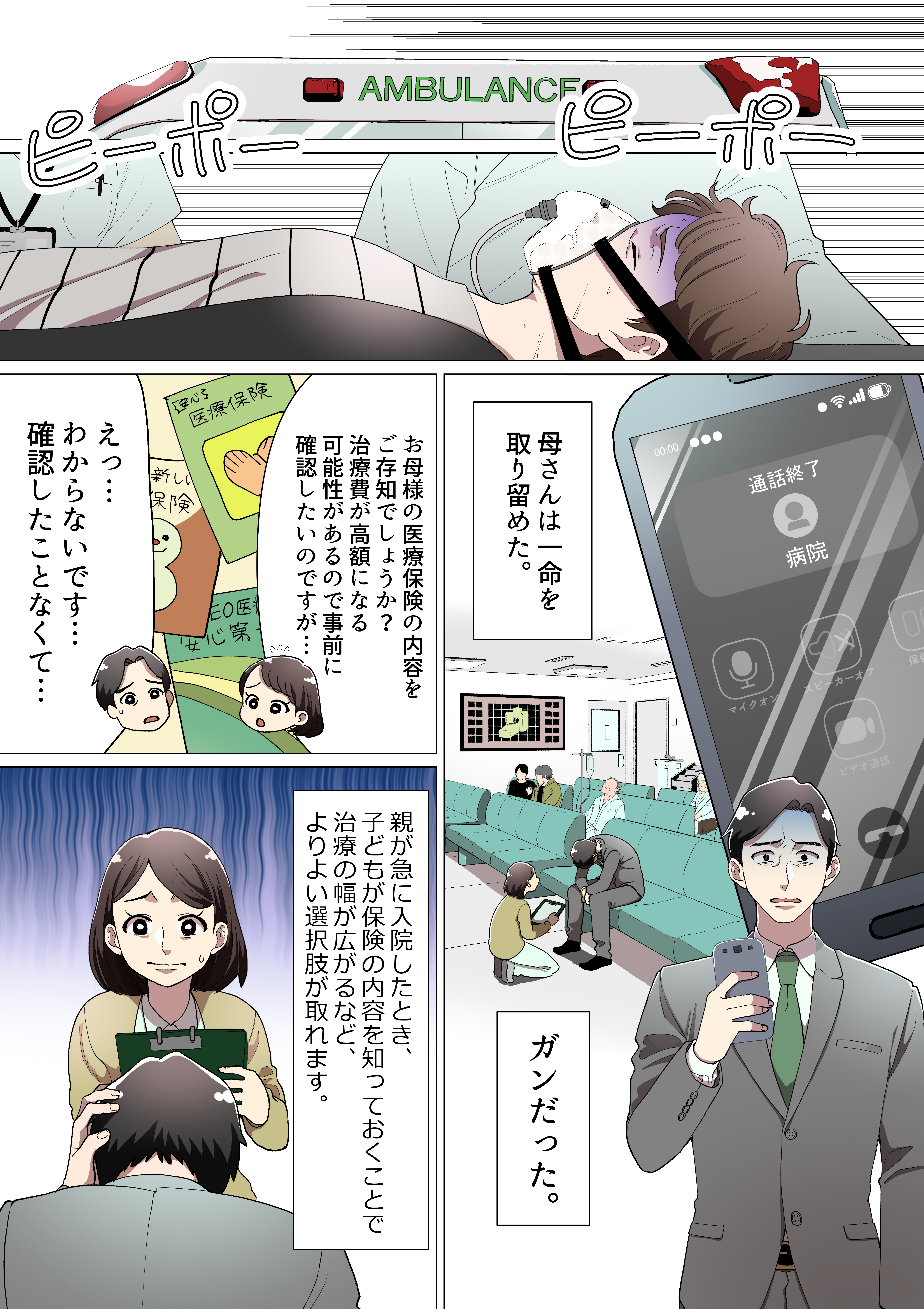 地元を離れ母親と離れて暮らす健太のもとに「母が倒れた」という知らせが届きました。自分の親が一体どういった保険に入っているか把握していなかった健太は、有事に備えて親と話していなかったことを後悔します。家族がどういった保険に入っているかを把握しておく重要性を改めて認識することになりました。