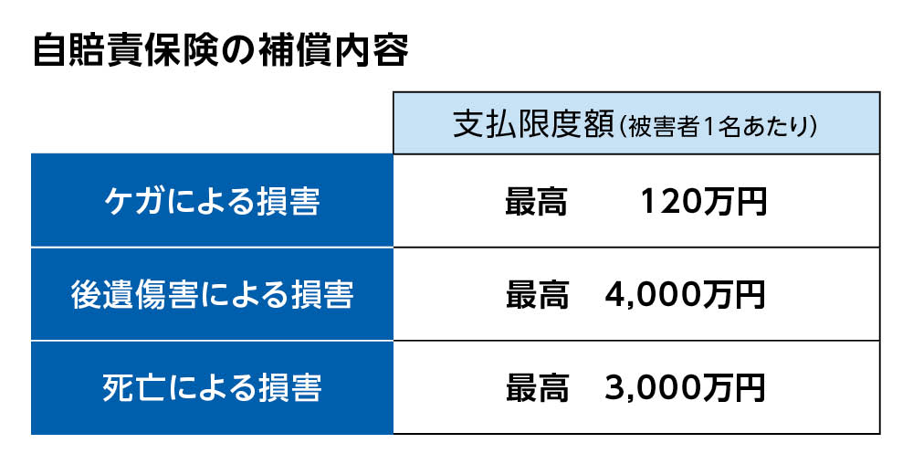自賠責保険は、自動車事故の被害者救済を目的とした保険です。補償範囲は対人賠償に限られており、保険金支払いの最高額も傷害で最高120万円、死亡時で最高3,000万円、後遺障害時で最高4,000万円と定められています。