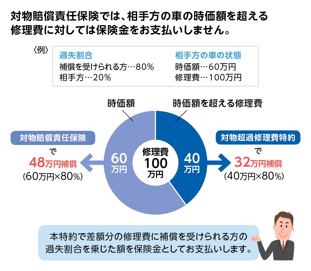 ところが、相手の車の時価が60万円であっても、実際の修理には100万円の費用がかかることもあります。この差額の40万円をめぐって、相手との間にトラブルが発生することがしばしばあるのです。こうした時、対物賠償責任保険に対物超過修理費用補償特約をつけておくと、この差額の40万円も補償されるので、示談交渉もスムーズに進みます。