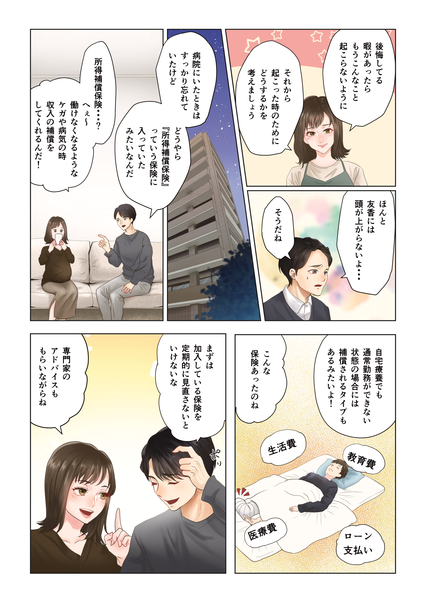 • 自身が働けなくなってしまうリスクに備えて、所得補償保険等で備えることが有効である。