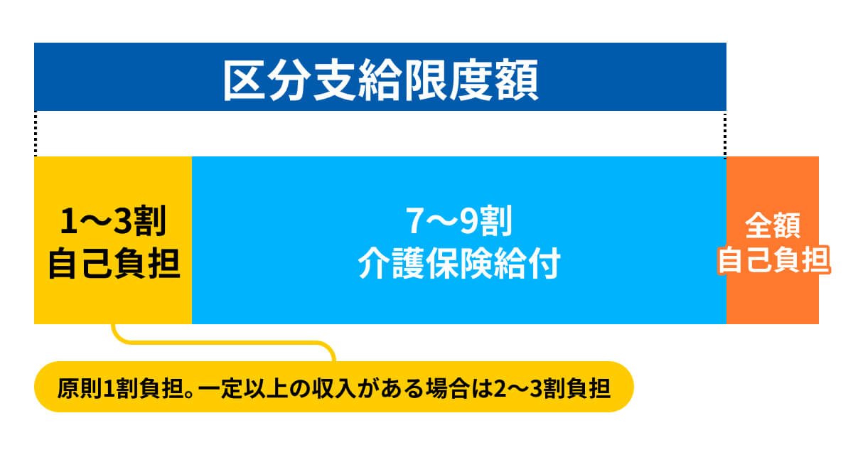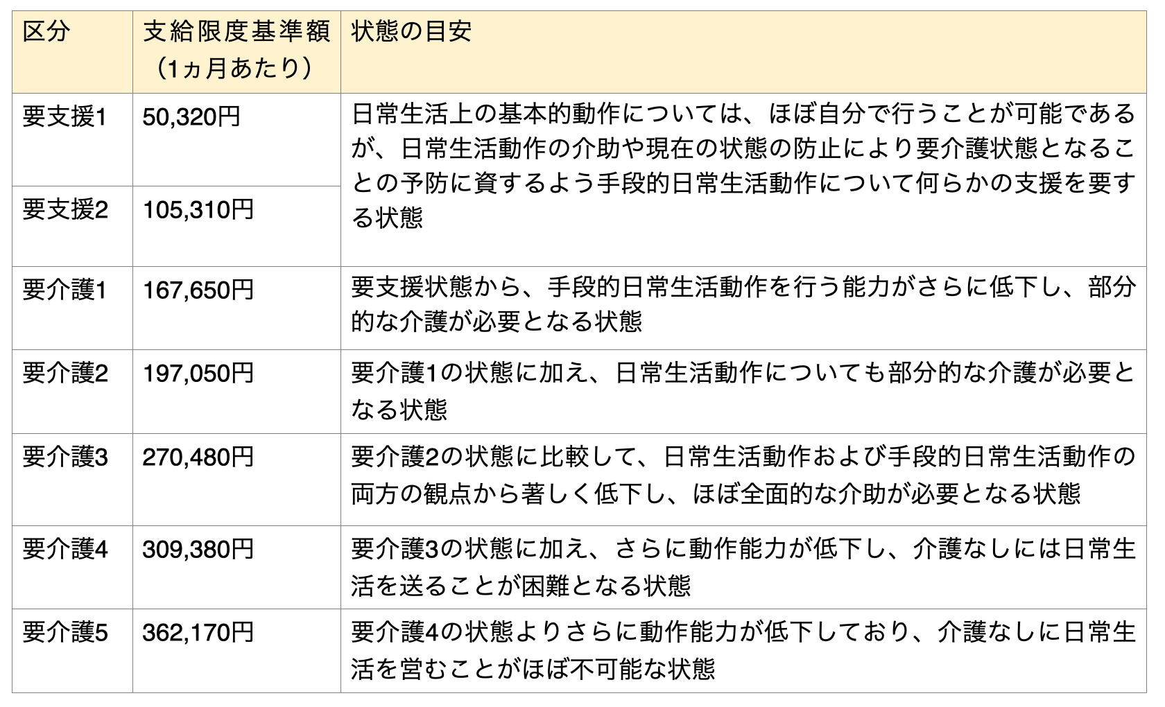公的介護保険は現物給付なので、所定の介護サービスなどに実際にかかった費用から自己負担分を除いた金額が、給付されます。また、月々の給付額には介護が必要な度合いに応じて上限(区分支給限度額)が定められています。それを超える分については、全額自己負担となります。