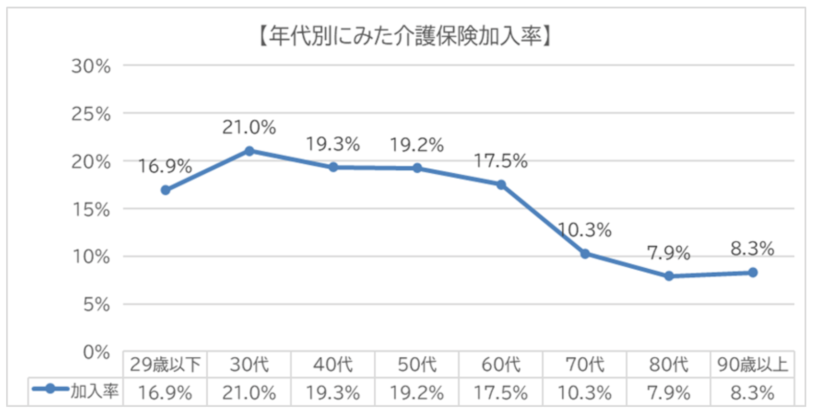 世帯主が40代の世帯では19.3%、50代では19.2%と5人に1人が加入していますが、以降下がる傾向です。